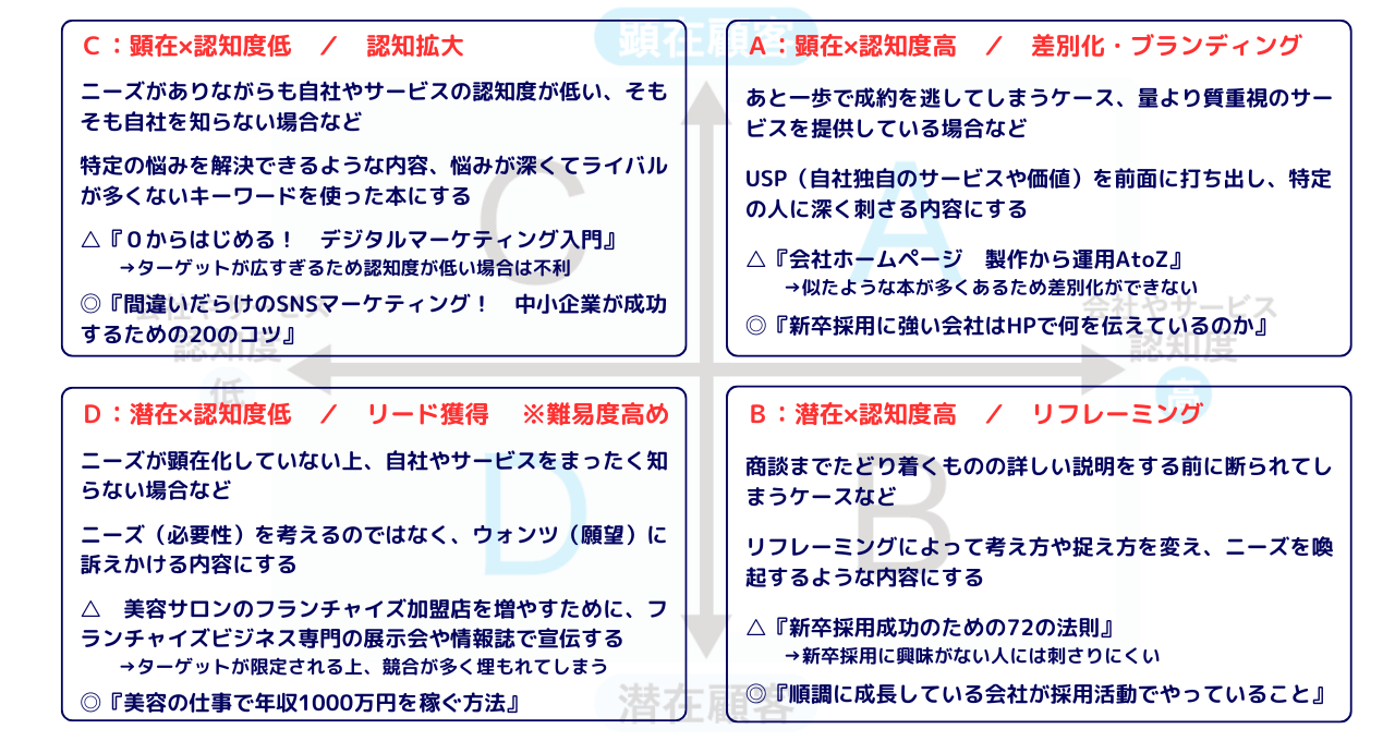 もし、ニーズが顕在化している人との商談がありながらも、あと一歩で成約を逃すことが多いのであれば、Aカテゴリーをターゲットとした、「差別化」や「ブランディング」を実現するための出版企画を立案しましょう。